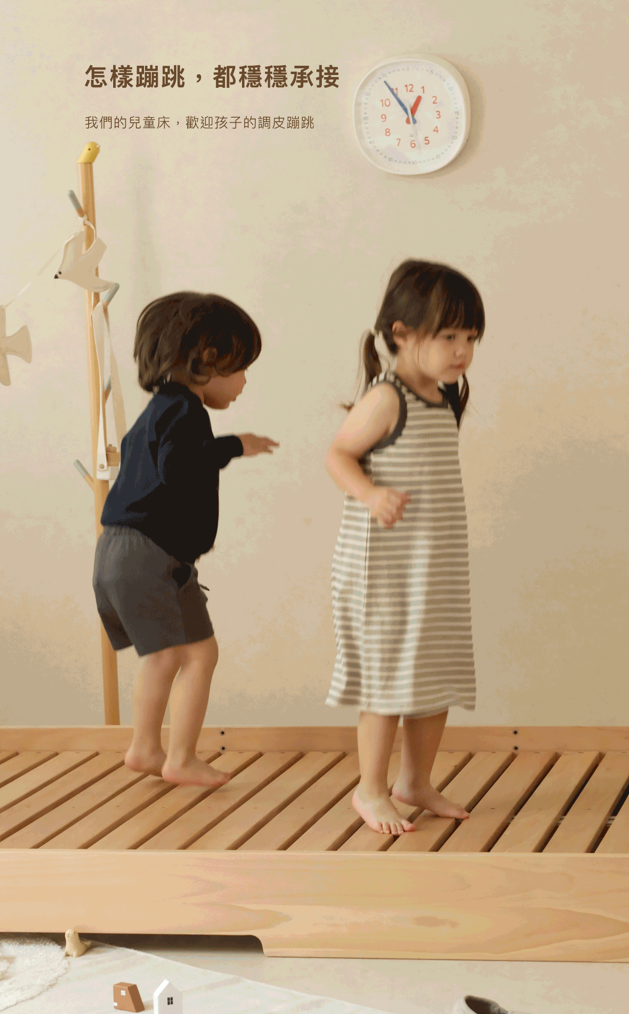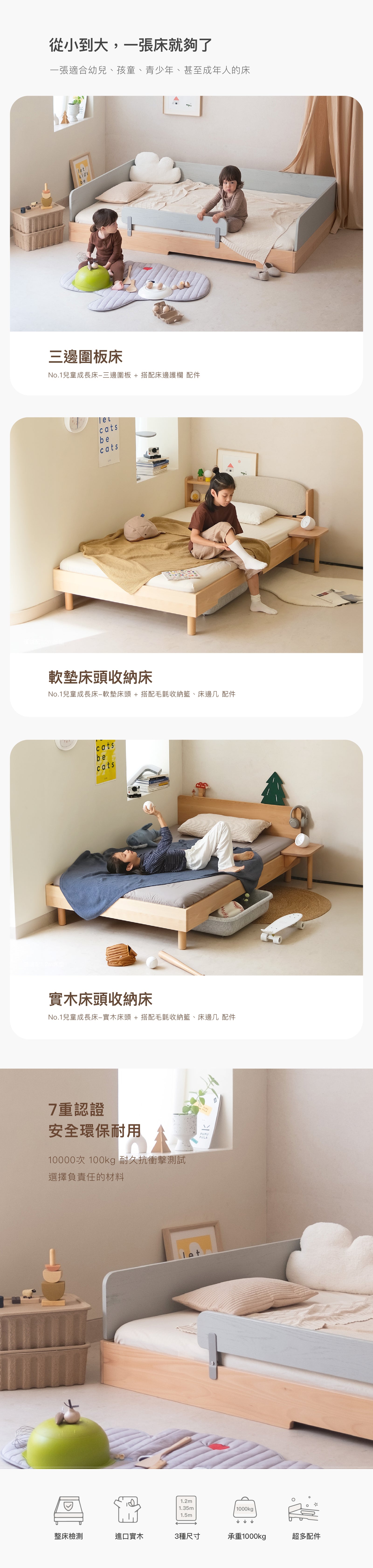 一張床,11款配件,90種變化:No. 1 兒童成長床 為成長中的小朋友及變化中的家庭設計,從地板床到普通高架床,都能夠透過配件搭配滿足新的需求。