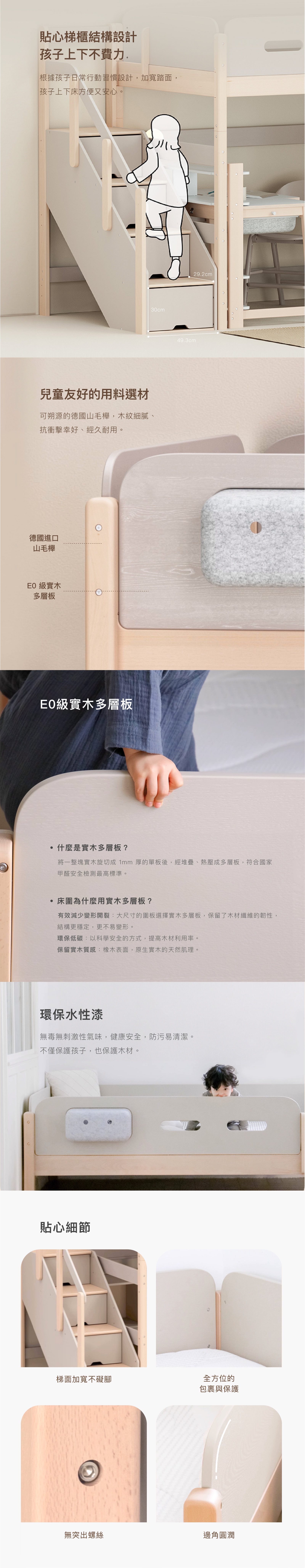 堅定不移的安全和安心:安全是我們的首要任務。上層床鋪設有安全的 4 面床圍,超出標準高度,提供更佳保護。床圍和支架採用 E0 級多層實木,在展現自然之美的同時,注重安全性。床架和階梯採用德國山毛櫸製成,梯子採用美國橡木製成,確保卓越的強度和耐用性。所有均採用環保水性塗料,表面無毒且易於清潔。